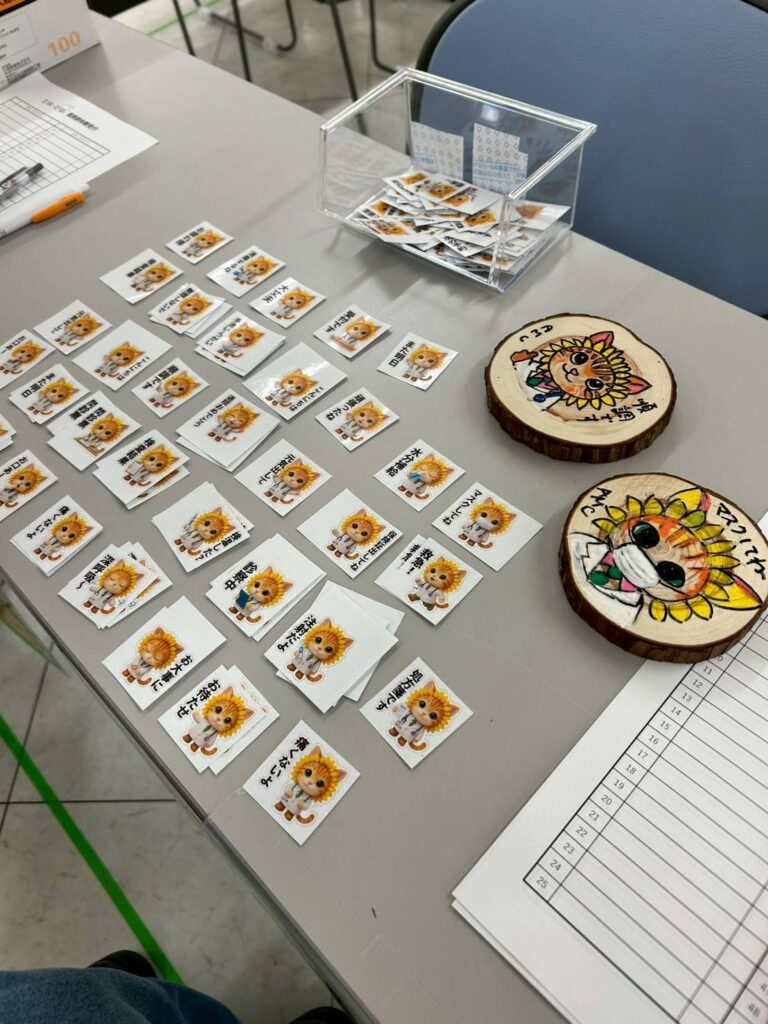 普段は直接あまり見ることのない臨床検査技師や薬剤師の仕事を体験している子供たちの表情はどの子もみんな真剣でしたが、体験を終えた後の表情はどの子もみんな笑顔であったのが印象的でした。また、今回は、当院副院長滝下医師作成のオリジナルキャラクターシールを用意し、体験していただいたお子様に持ち帰っていただきましたが、こちらも大変好評でした。ちなみに、余談ですが、シールの隣に置いてある木に書いたイラストは、今回参加した医師と看護師が他ブースの体験で描いたものですが、クオリティの高さに驚きました!また次回もこのような機会があれば参加させていただきたいと思っていますので、楽しみにしていてくださいね(*^_^*)